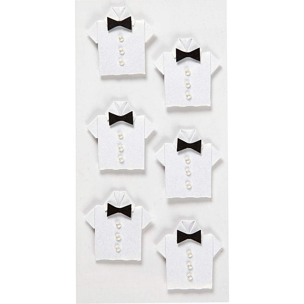 Autocollants en forme de chemise avec coussinet autocollant au dos pour un effet 3D. La chemise est pliée en origami avec des détails extra fins en papier blanc, un noeud papillon noir et des petits boutons ressemblant à des pierres précieuses