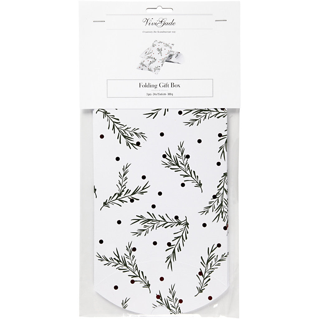Boîte d'emballage à plier, branche d'épinette avec boules de Noël, dim. 18x15x6 cm, 300 gr, vert, rouge métallique, blanc, 3 pièces/ 1 Pq. [HOB-25357]