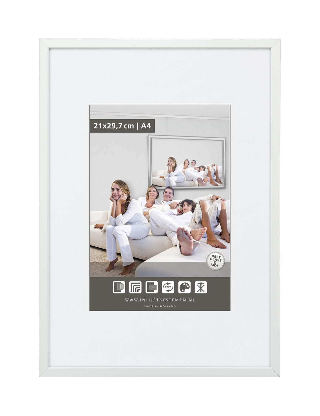 Cadre avec une fenêtre en poly à transparence cristalline et incassable. Aspect élégant dans n'importe quelle pièce. Le cadre est disponible en différentes tailles.