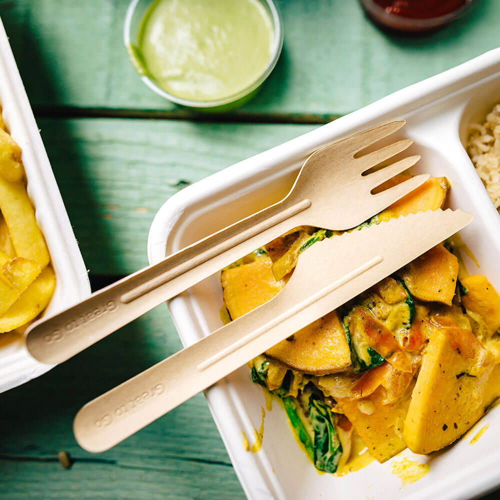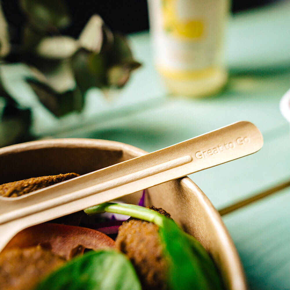 L'aspect brun papier leur confère également un aspect écologique pour votre repas. Le manche est gravé de l'inscription "Great to go". En outre, ce produit est également disponible en cuillèreet couteau.