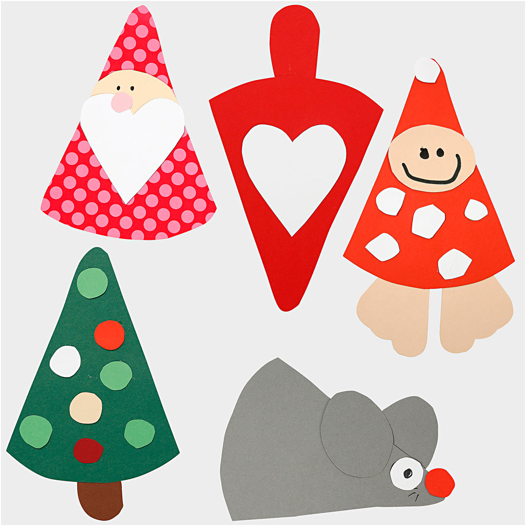 Kit de matériel créatif et modèles pour la confection de décorations de Noël populaires. Contenu: 8 feuilles de papier cartonné A4 aux couleurs unies, 4 feuilles de papier cartonné A4 à motif, 1 feuille de papier cartonné doré, 18 paires de yeux loucheurs, 5 m de fil doré, pierres de strass autocollantes, feuille de modèles.