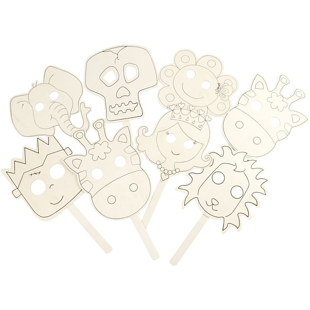 Masques en bois avec trous, poignée et décoration. Paquet de 8 designs différents avec 2 de chaque. Facile à décorer avec la peinture acrylique Plus Color, les marqueurs Poster Hobby, etc.