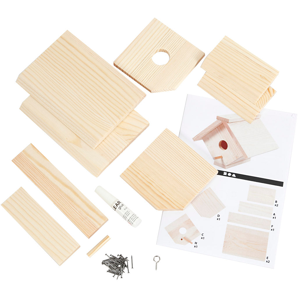Set de matériel à assembler pour la confection d'un nichoir en bois clair avec un trou de 25 mm. Instructions incluses